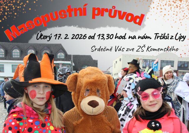 V úterý 17. února projde masopustní průvod plný klasických i méně tradičních masek od školy v Komenského ulici až na náměstí, kde bude přivítán ve 13:30 hodin. Přijďte si společně zazpívat a zatančit.