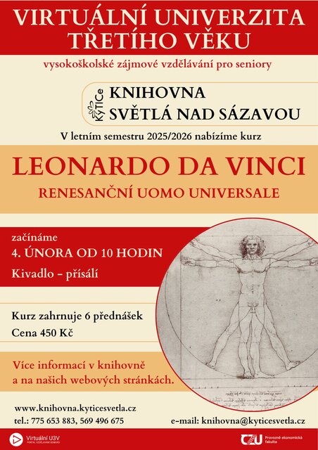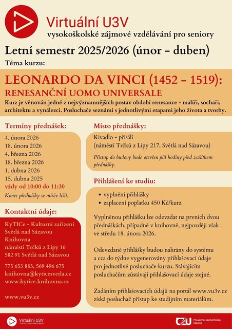 První přednáška 4. února a druhá přednáška 18. února od 10:00 v přísálí tanečního sálu Kivadla. Obě přednášky jsou nezávazné, teprve poté může zájemce vyplnit přihlášku a zaplatit poplatek. Termíny dalších přednášek na téma Leonardo da Vinci(1452 - 1519): RENESANČNÍ UOMO UNIVERSALE pro přihlášené budou probíhat v termínech: 4.3., 18.3., 1.4., 15.4.